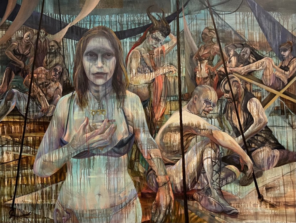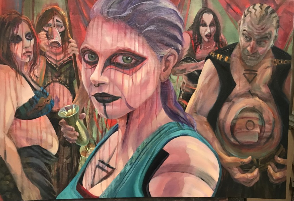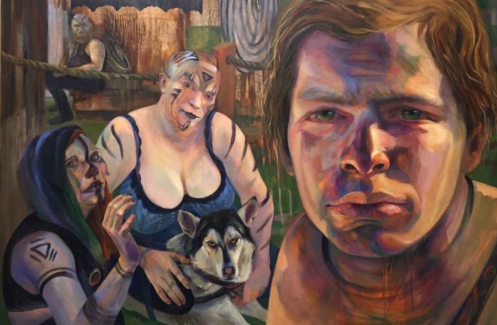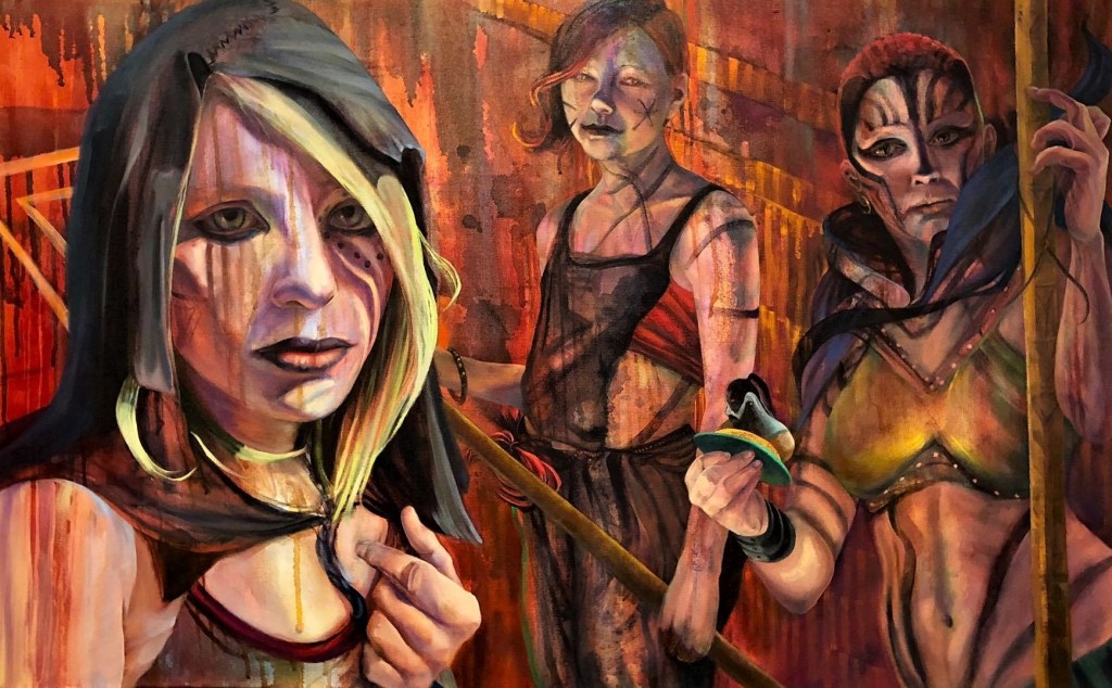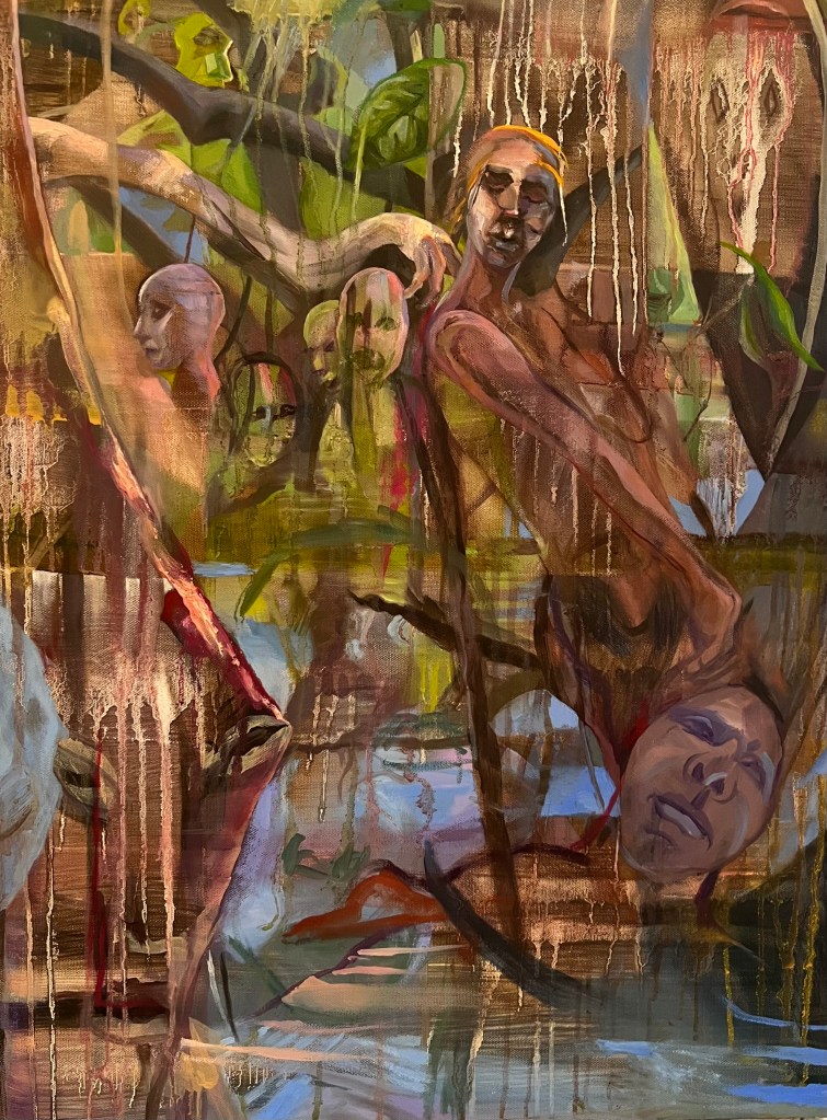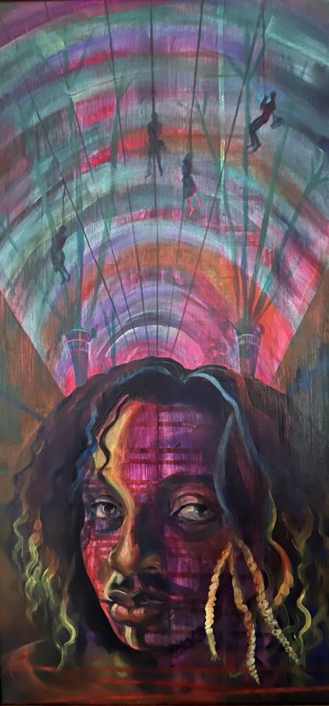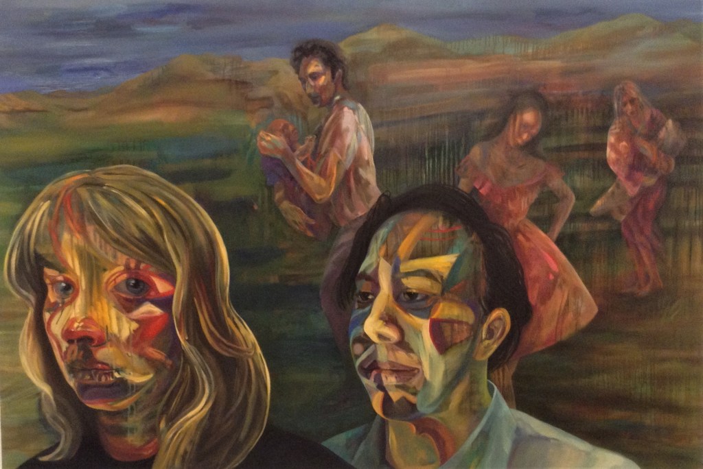 Guardians of the Wilds Acrylic and Oil on Canvas. Outside the Wilds, Oil on Canvas, 40″ x 60″Massacre at the Mandalay, Acrylic and oil on canvas.Portrait of my daughter, Anna Hija con Clown Oil on Canvas 36″ x24″Exodus to the Central Valley, Oil on Canvas, 48″ x 72″Point of Tangency Oil on Canvas 48″ x 84″