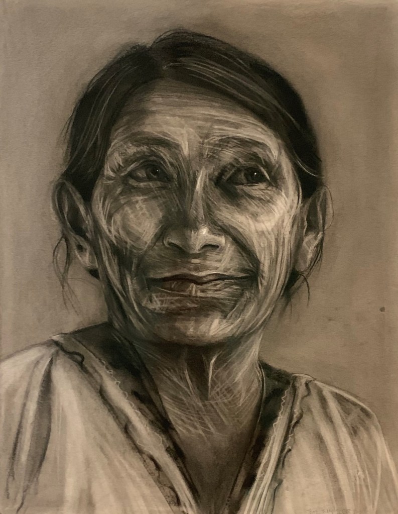 Portrait for Liz Brothers, La Comadrona, charcoal on paper.